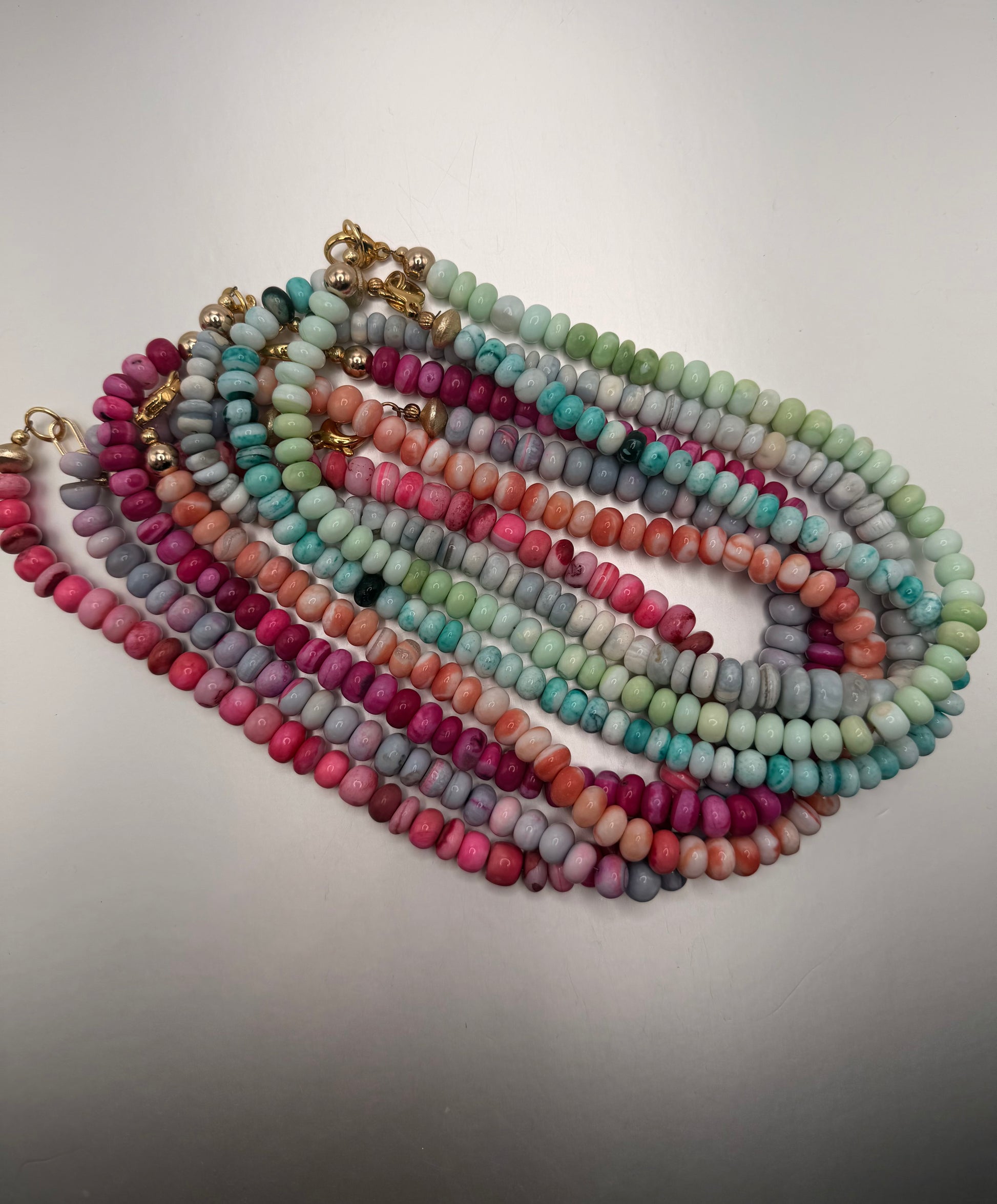 The prettiest colors (from left to right- hot pink, light purple, purple/pink, coral, light blue, turquoise, lime green). Gold filled clasp.